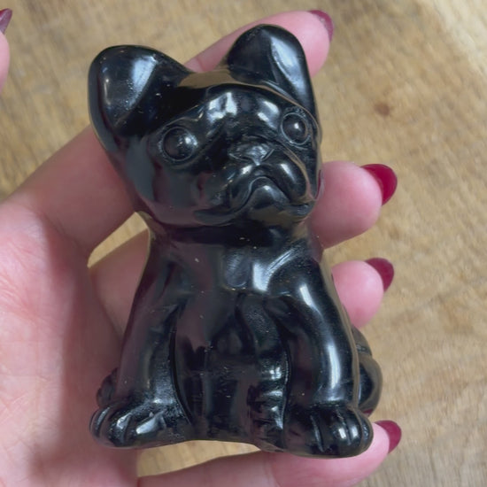 Découvrez cette figurine de bouledogue sculptée à la main dans une obsidienne noire naturelle.
