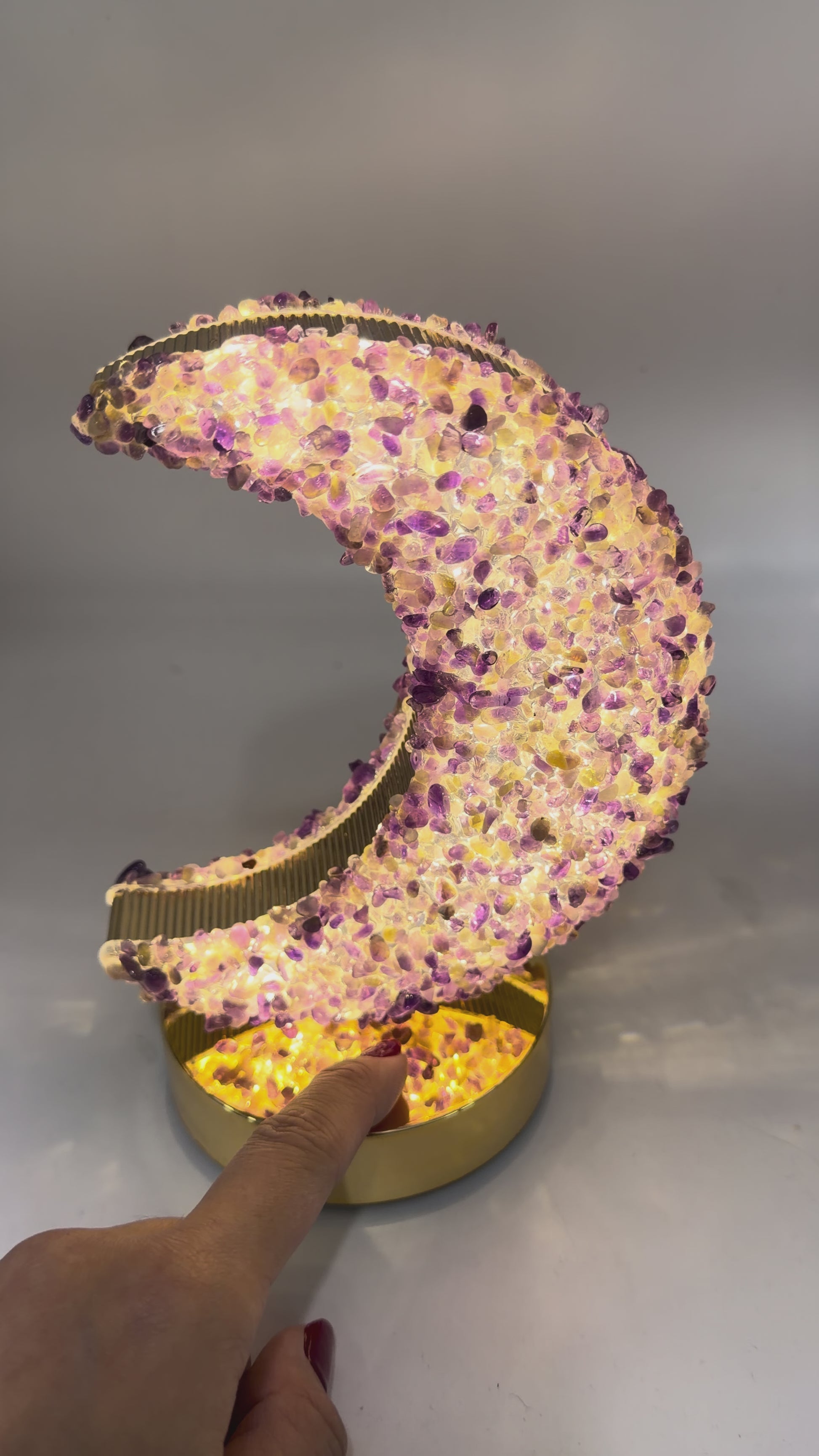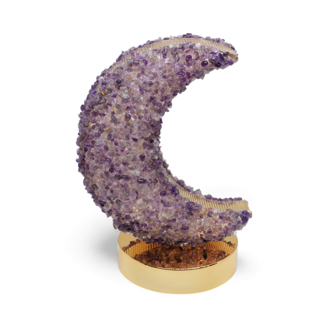 Sublimez votre intérieur avec cette lampe lune raffinée, décorée de véritables mini-pierres d’améthyste soigneusement disposées à la main. Son design alliant doré miroir et cristaux naturels apporte une touche à la fois moderne, lumineuse et spirituelle à n’importe quelle pièce.