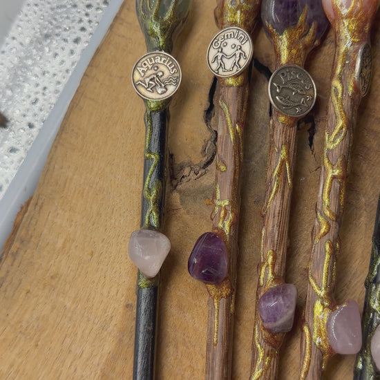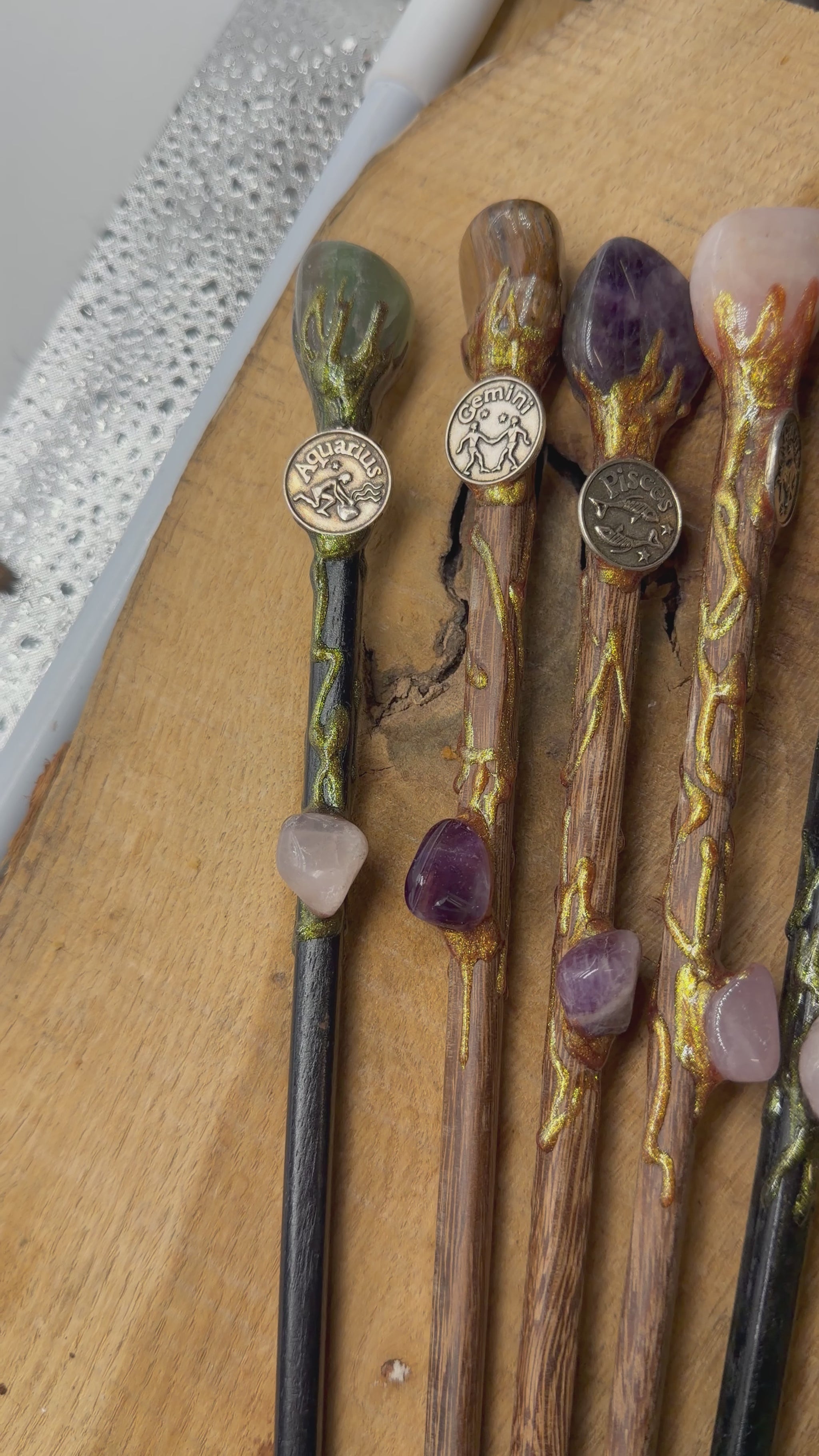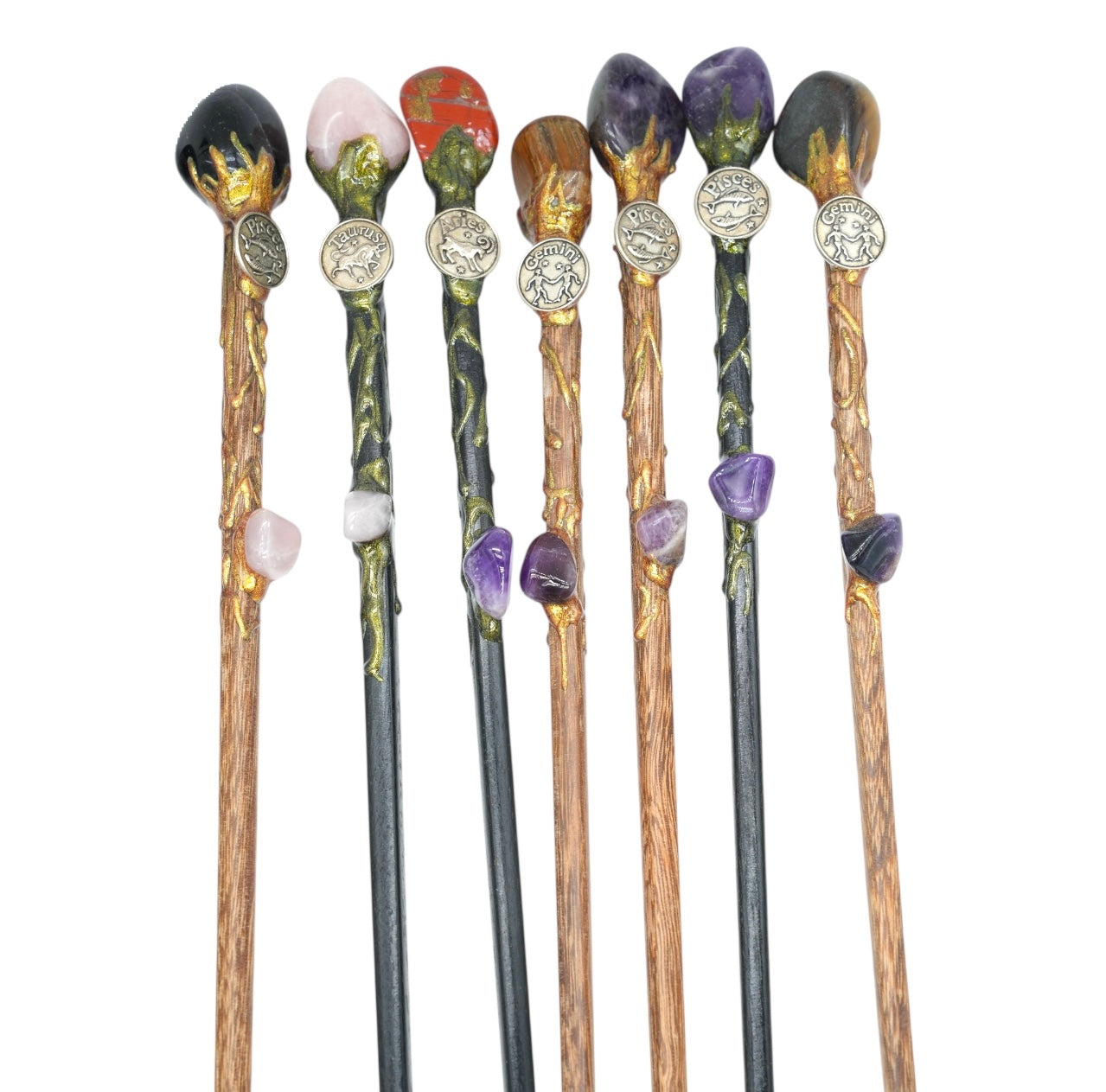 Baguette magique en pierre artisanale & signe astro pour rituel & méditation 35 cm à l’unité aléatoire