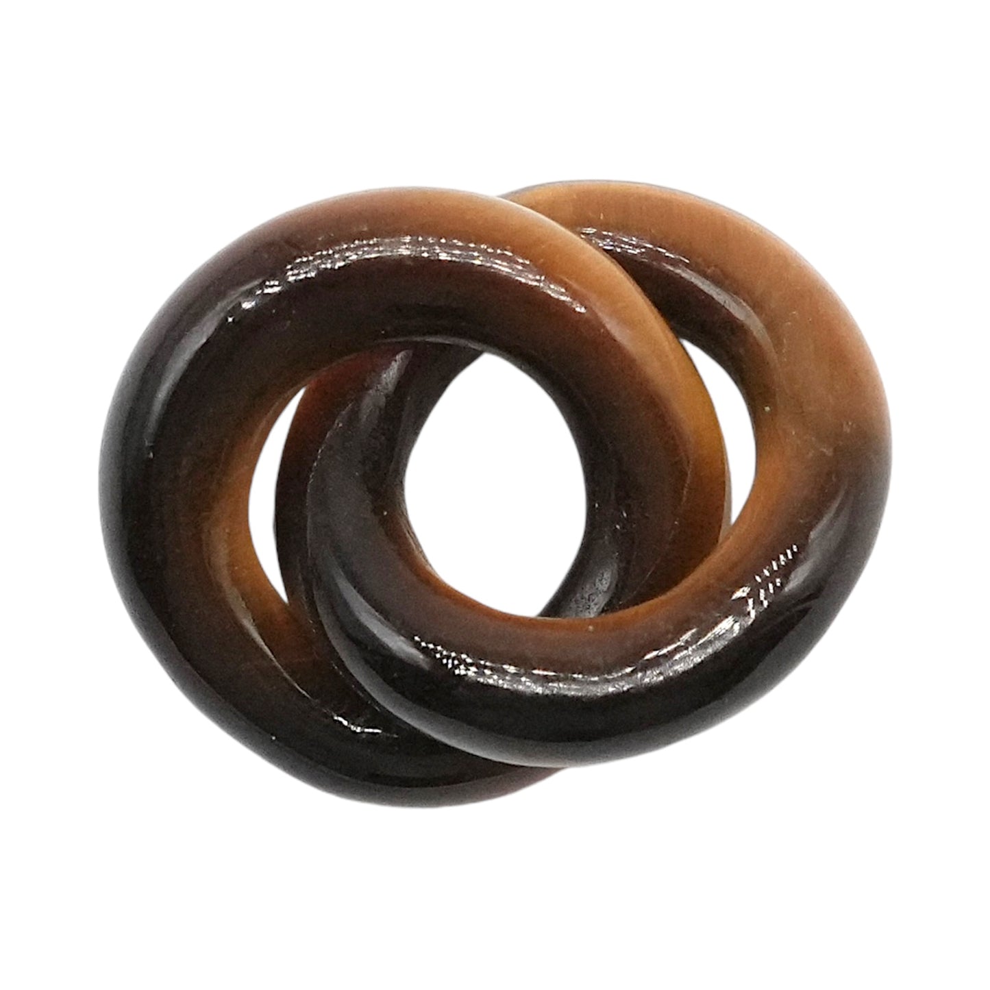 Cet objet représente deux anneaux entrelacés, symbolisant l’unité, l’harmonie, et l’infini. Dans un contexte spirituel, il peut évoquer des liens inaltérables, comme l’amour ou l’équilibre. Il apporte également des qualités de protection et de confiance en soi car à l’œil de tigre