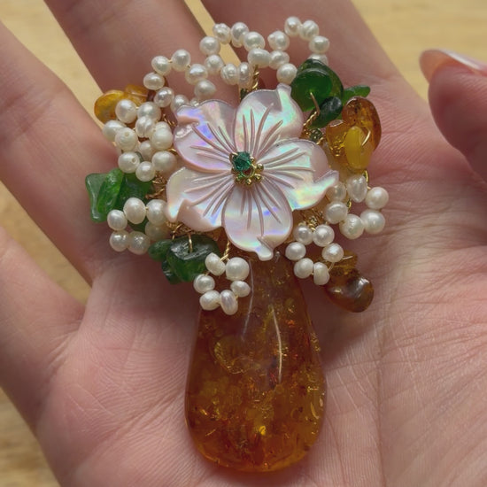 Broche fleurie en Ambre baltique de Pologne, nacre, peridot & perle de rivière naturellement taillée à la main.