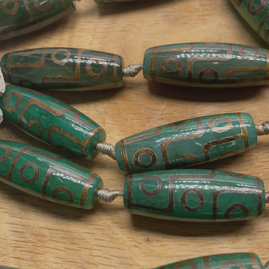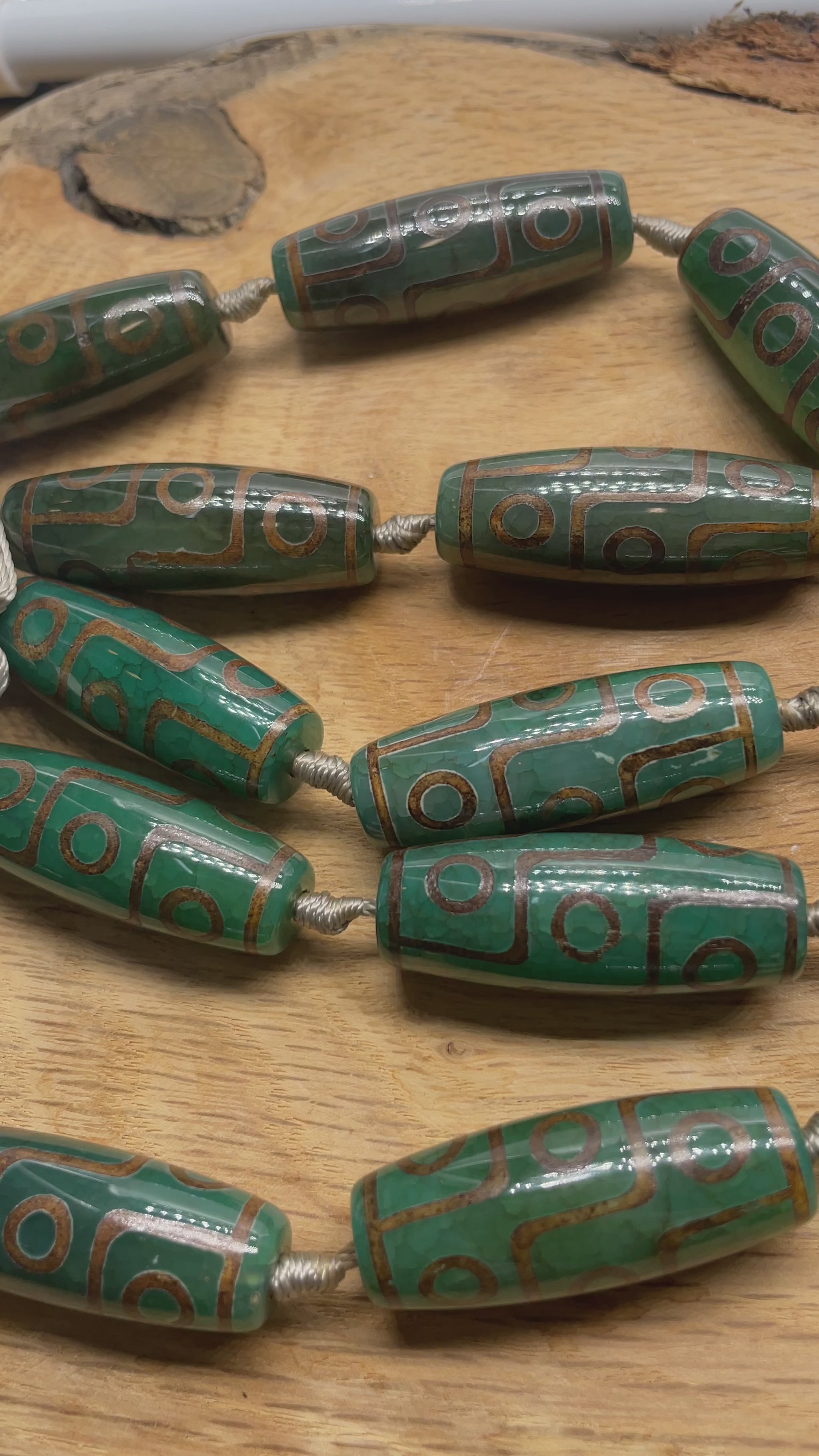 Les perle Dzi sont des perles d’agate gravées de lignes géométriques et de motif en forme d’œil (pour conjurer le mauvais œil) en nombre impair (pour porter chance).