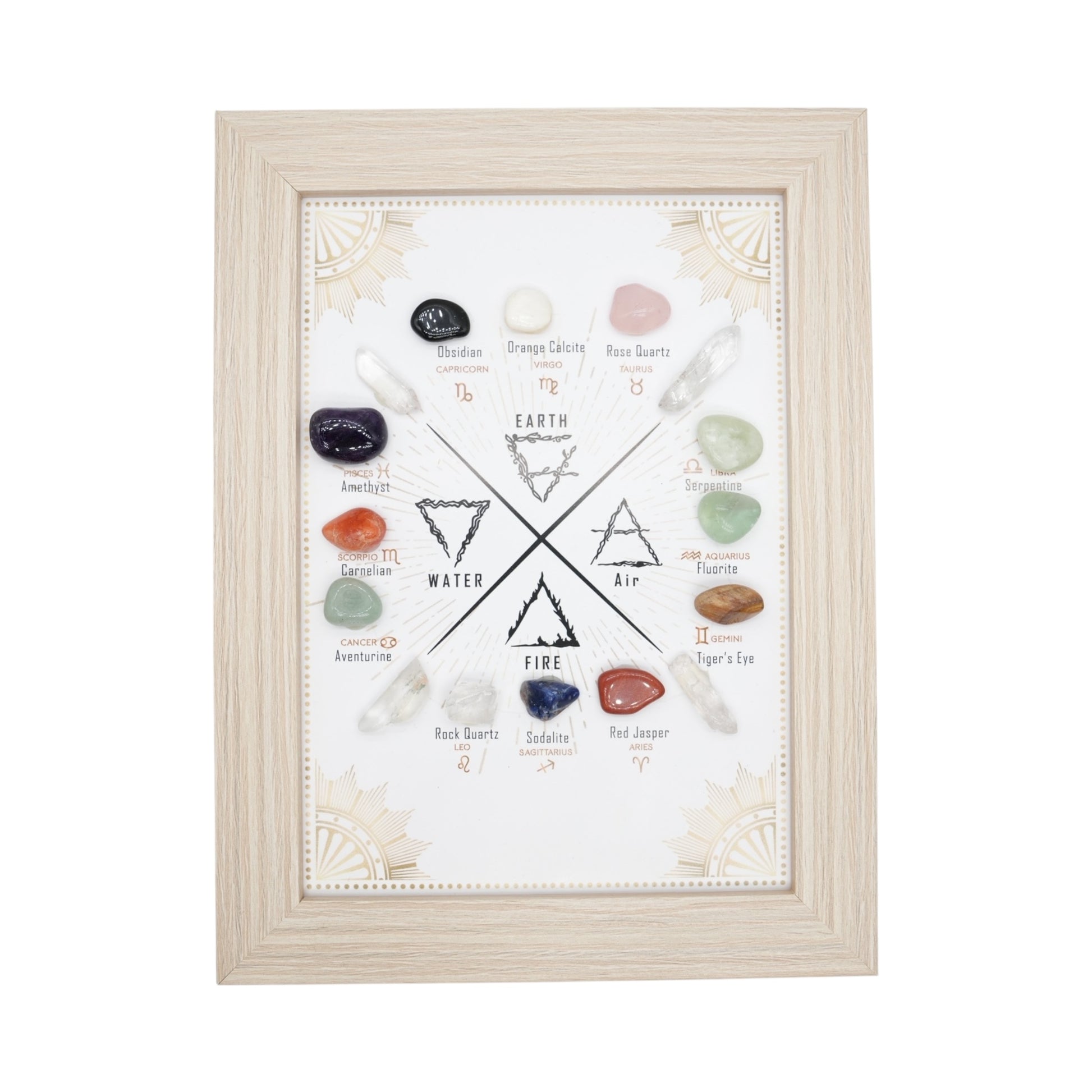Ce cadre unique associe les 12 signes astrologiques à leurs pierres naturelles correspondantes, réparties selon les 4 éléments (Terre, Air, Eau, Feu). Chaque pierre est soigneusement positionnée autour du cercle zodiacal, mettant en valeur ses énergies et ses vertus.