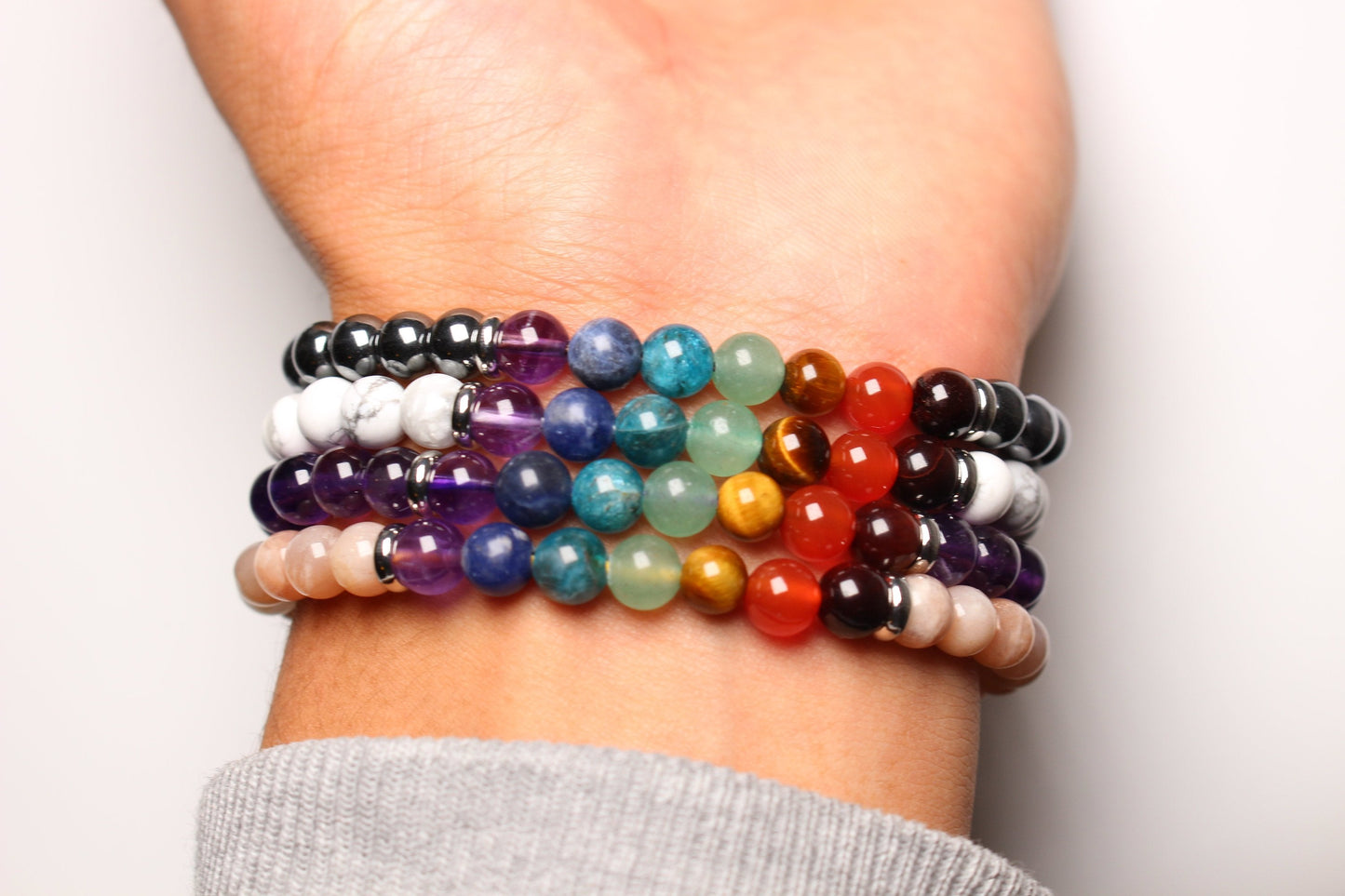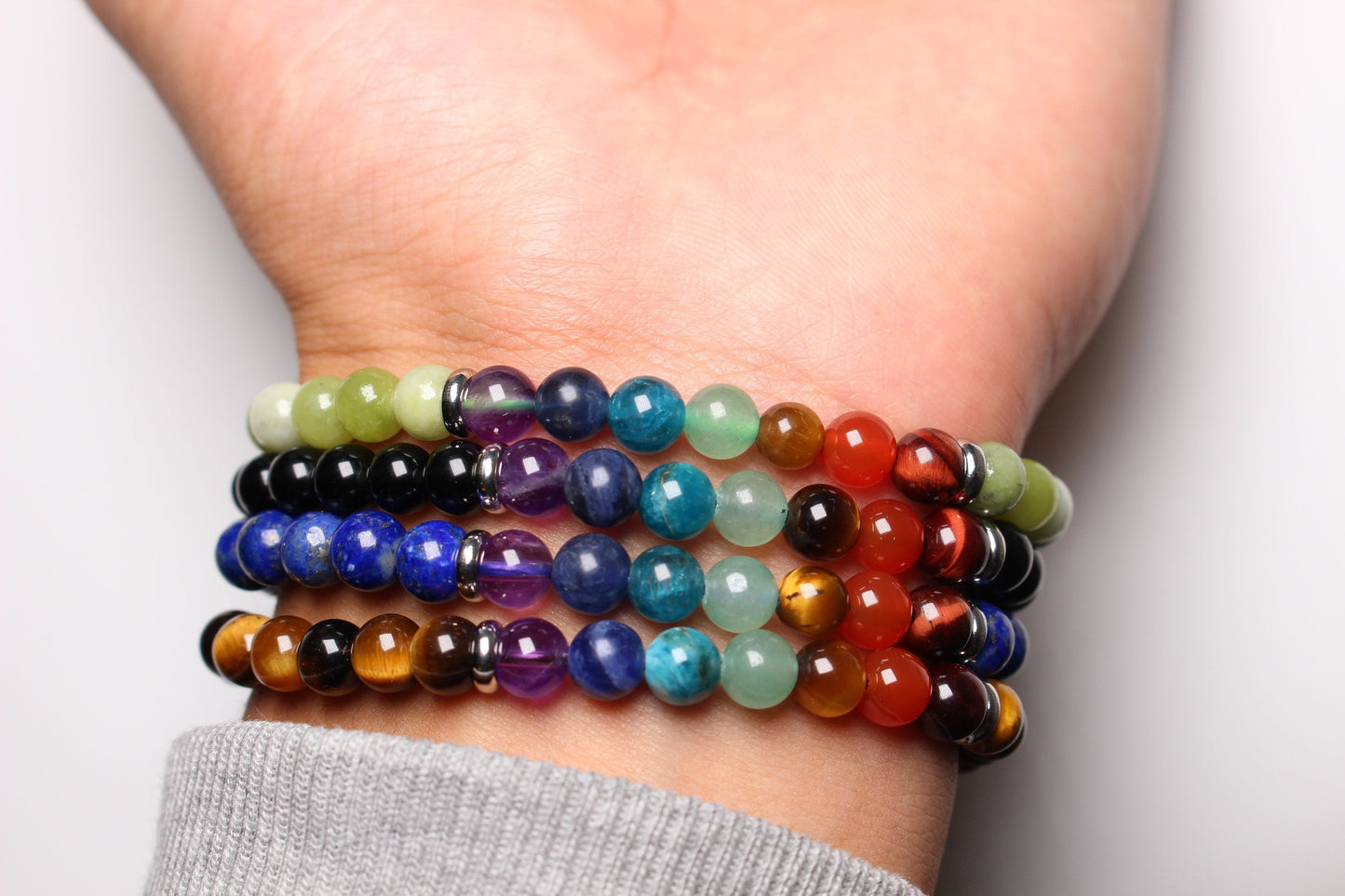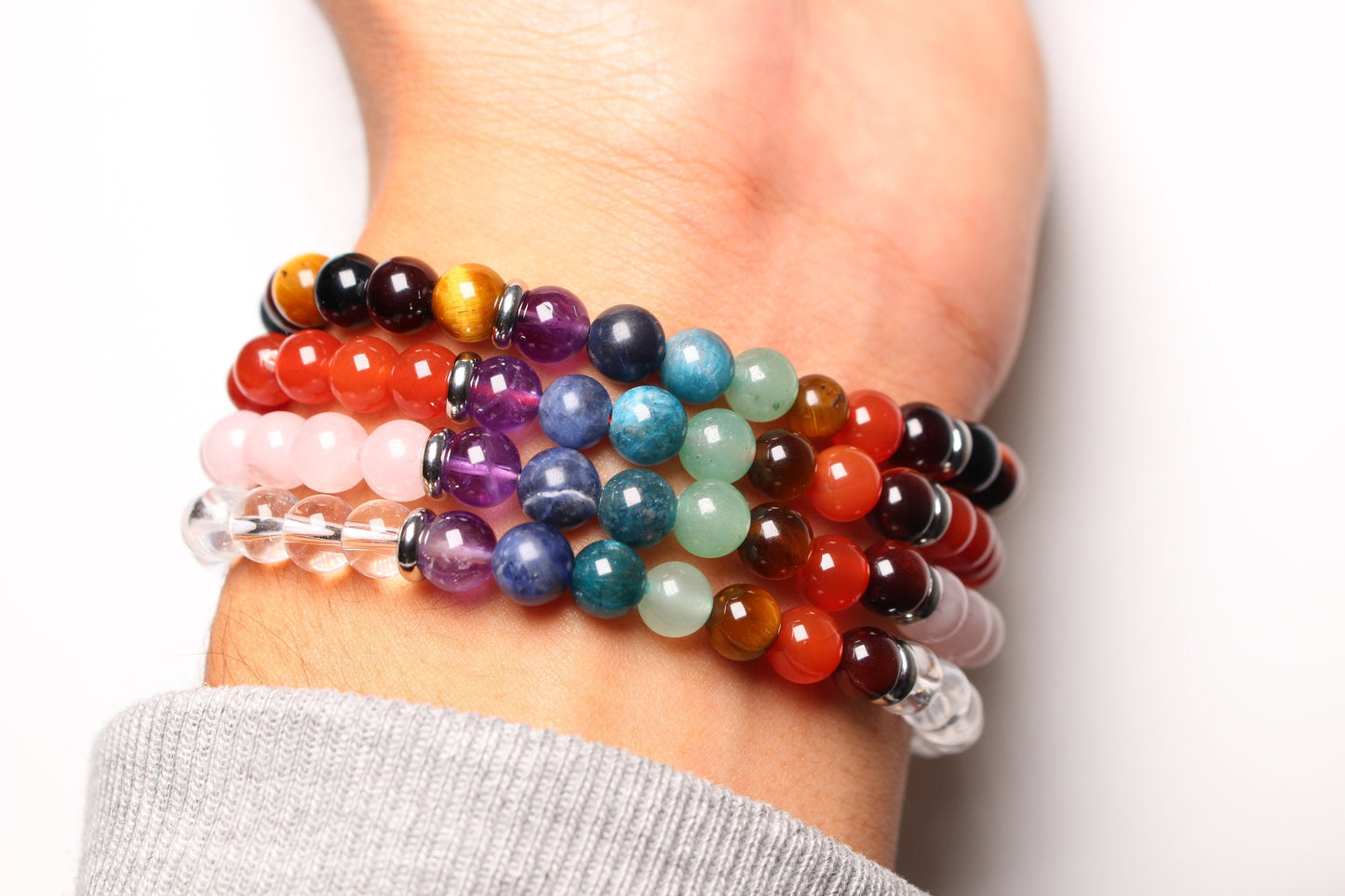 7 chakras : Améthyste, Sodalite du Brésil, Apatite bleue, Aventurine verte, Oeil de tigre , Cornaline ,Oeil de taureau