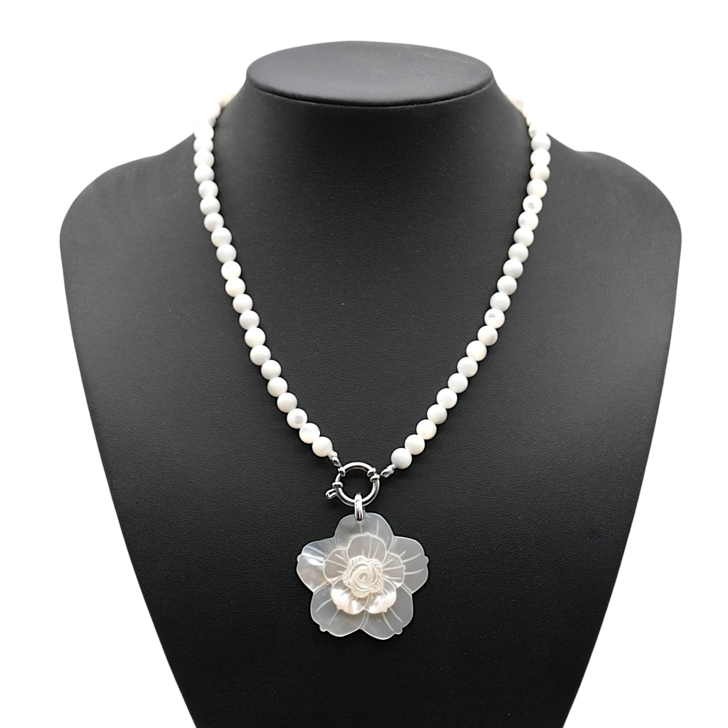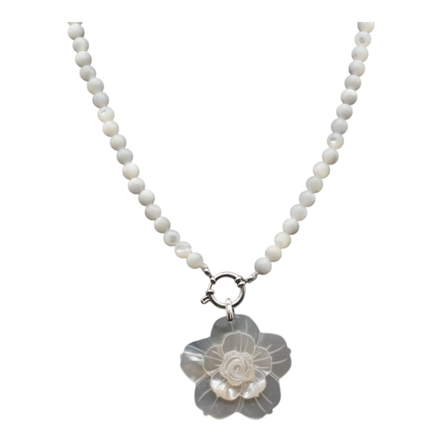 Collier boule en nacre attache bouée en acier argenté avec pendentif fleur