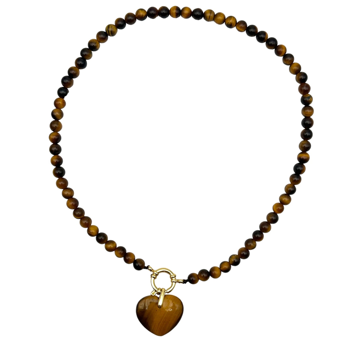 Collier boule en oeil de tigre attache bouée en acier dorée avec pendentif coeur
