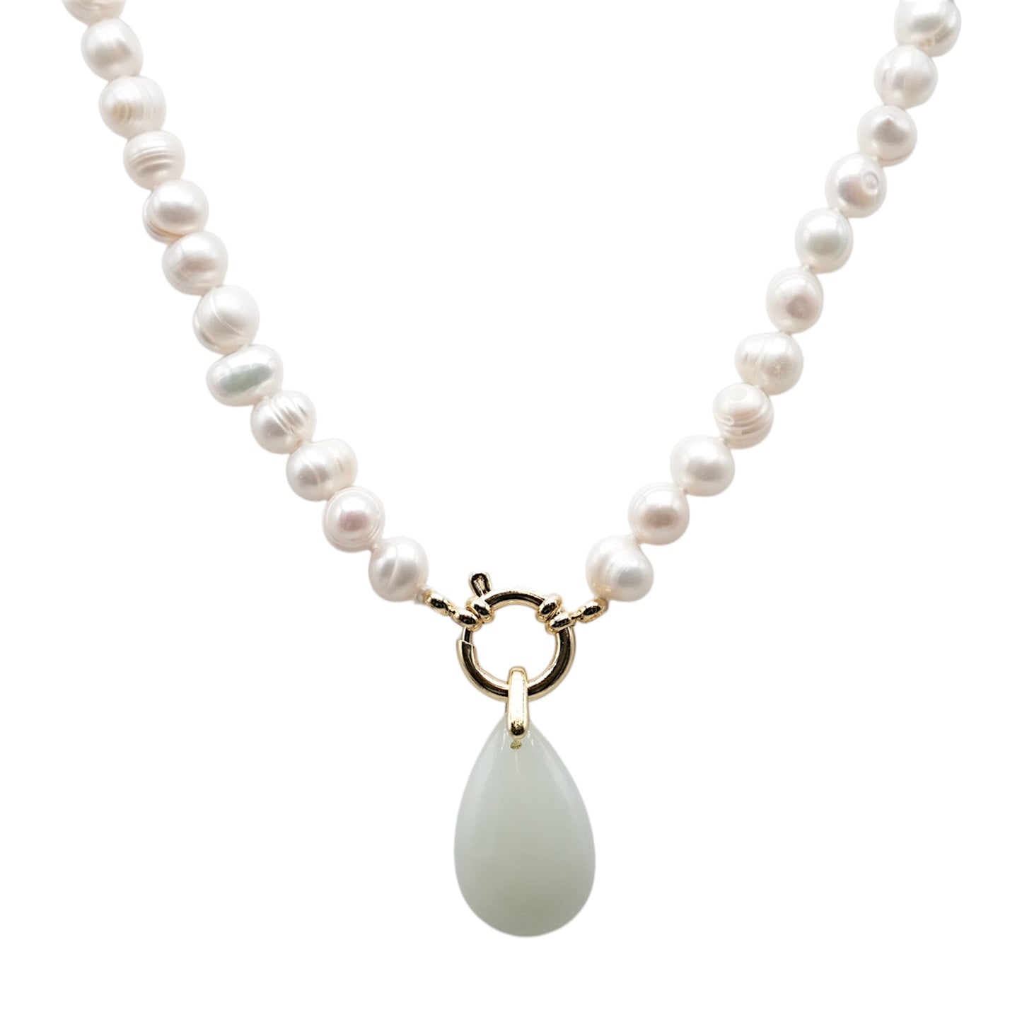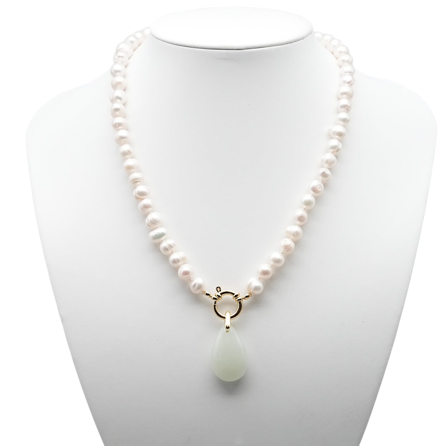 Collier perle d’eau douce 7-8 mm bouée en acier doré ou argenté avec pendentif Jade de Chine