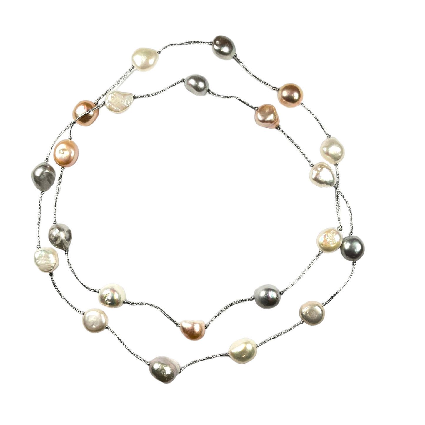 Collier Sautoir en perles d’eau & polyester argenté SA - 3