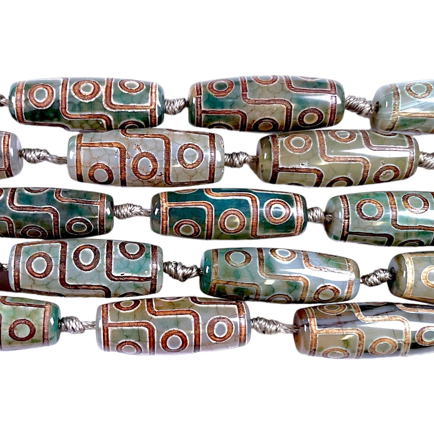 Les perle Dzi sont des perles d’agate gravées de lignes géométriques et de motif en forme d’œil (pour conjurer le mauvais œil) en nombre impair (pour porter chance).