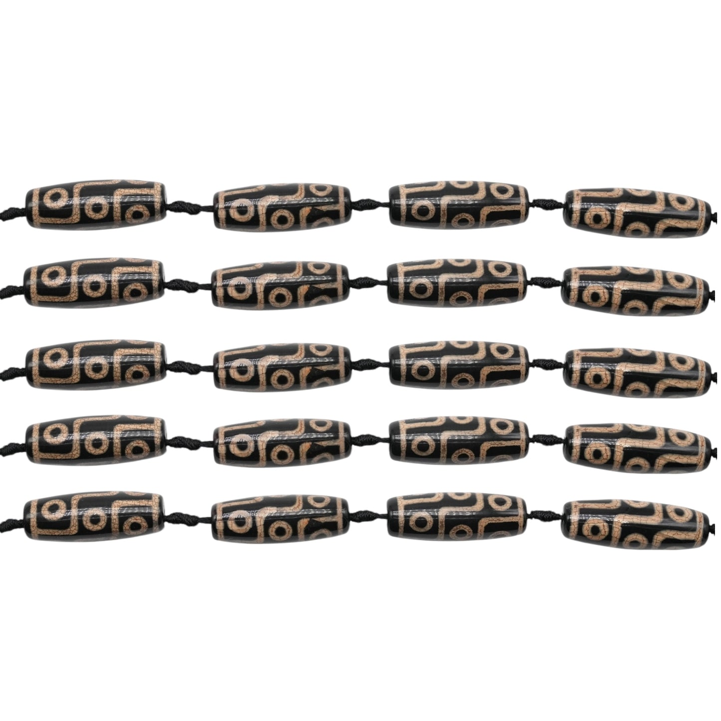 Les perle Dzi, en agate sont gravées de lignes géométriques et de motif en forme d’œil (pour conjurer le mauvais œil) en nombre impair (pour porter chance).