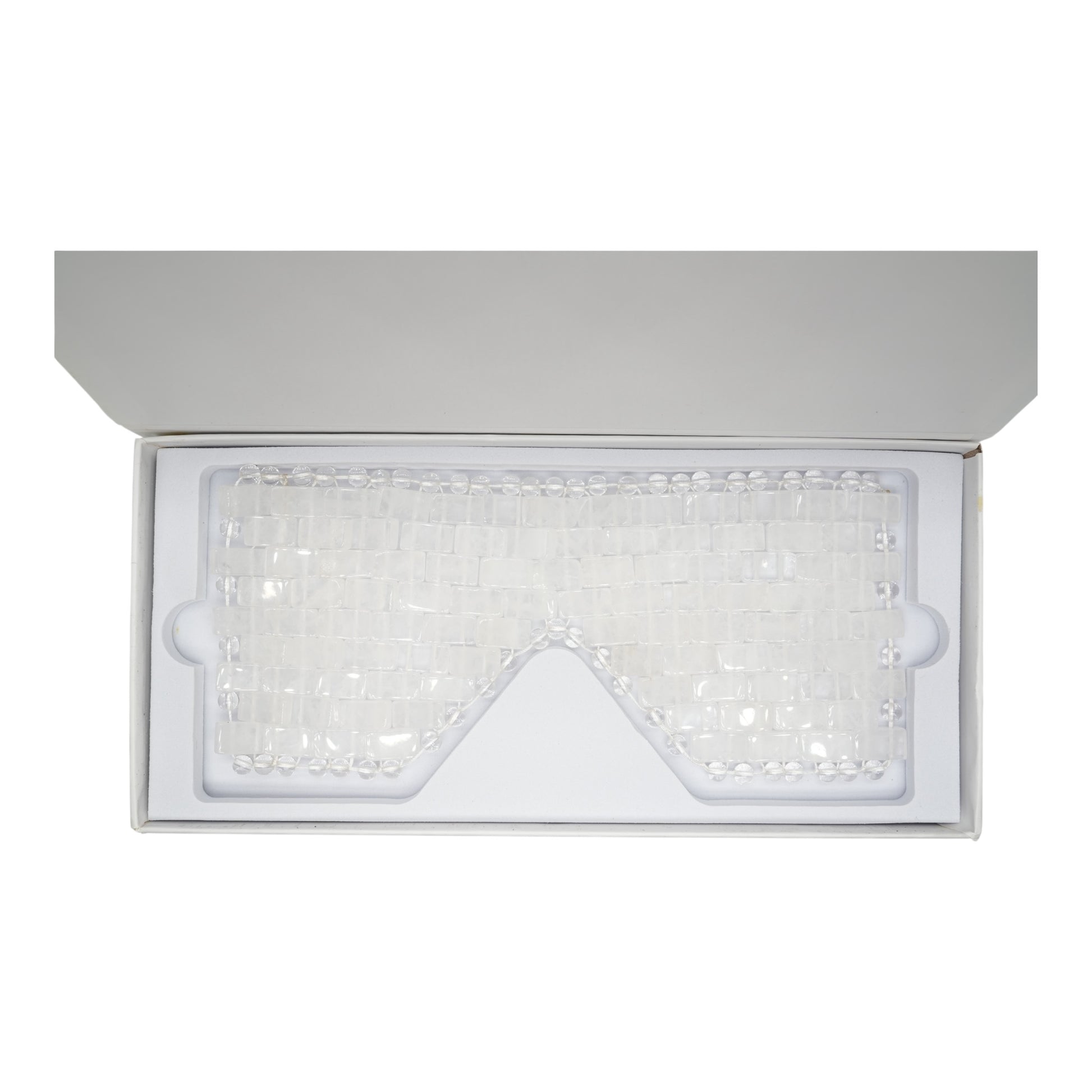Ce masque est composé de pierres naturelles taillées et assemblées à la main en perles rectangulaires et rondes, conçues pour épouser parfaitement la forme du visage et du contour des yeux.